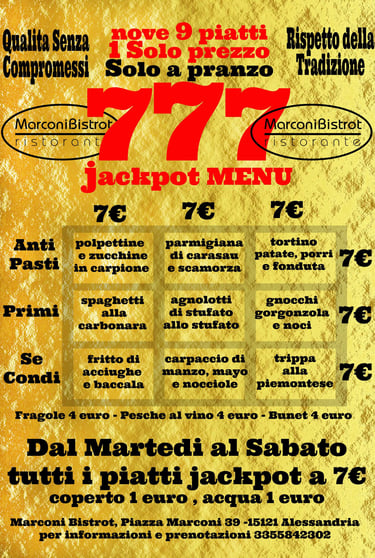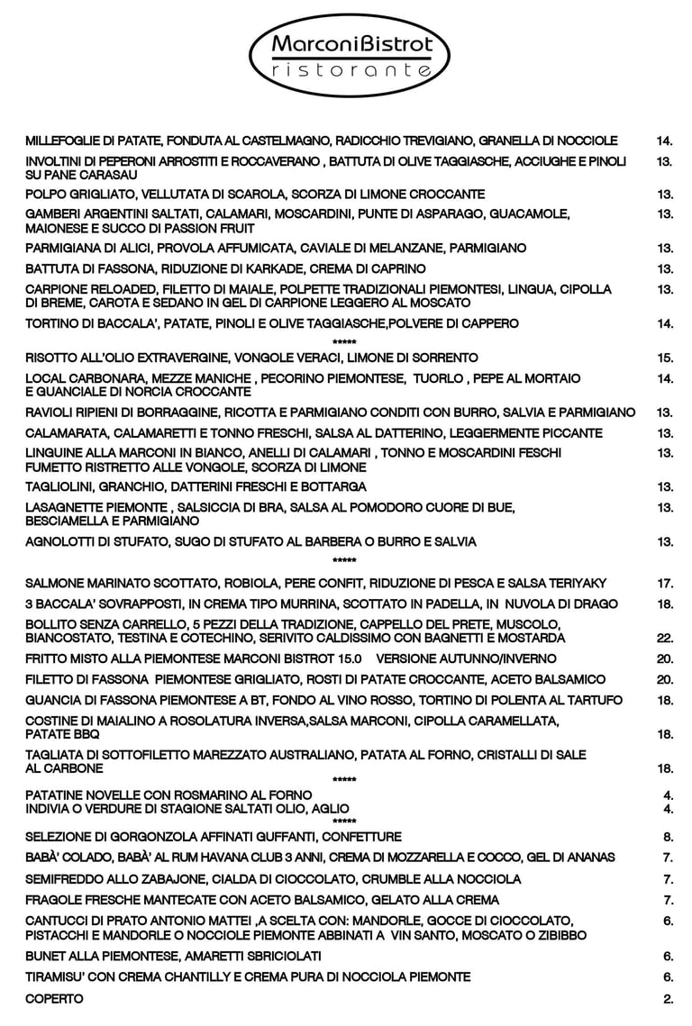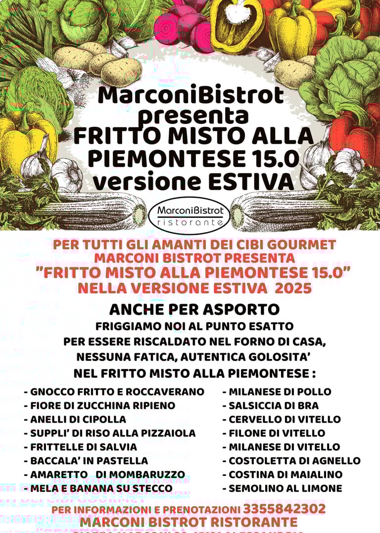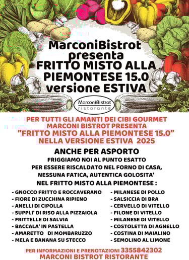 Per tutti gli amanti del buon cibo Gourmet in queste pagine troverete il Menú aggiornato del MarconiBistrot Ristorante, incluso il nostro esclusivo Fritto Misto alla Piemontese 15.0 con 16 ingredienti fritti della tradizione e non solo, nella nuova VERSIONE 2025 !!!