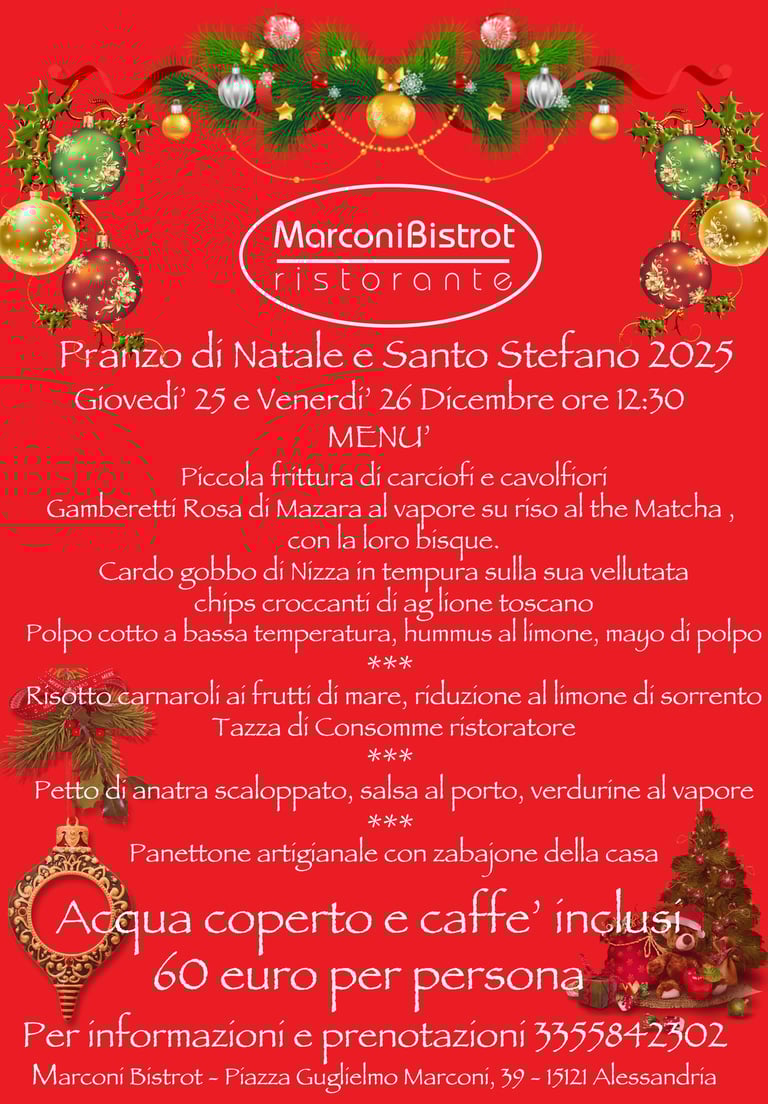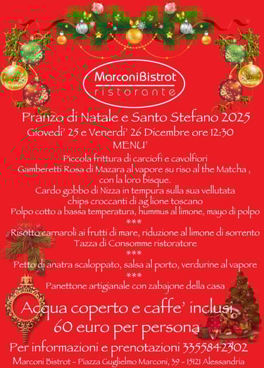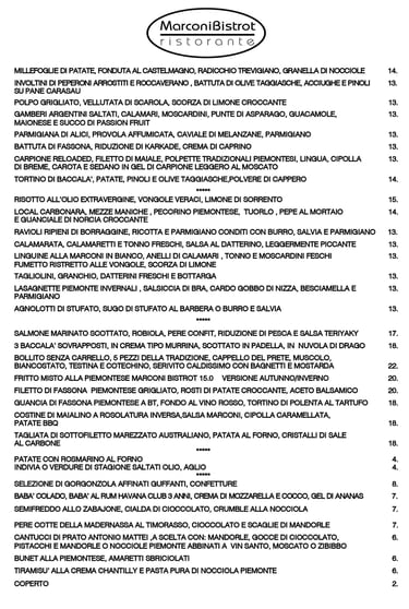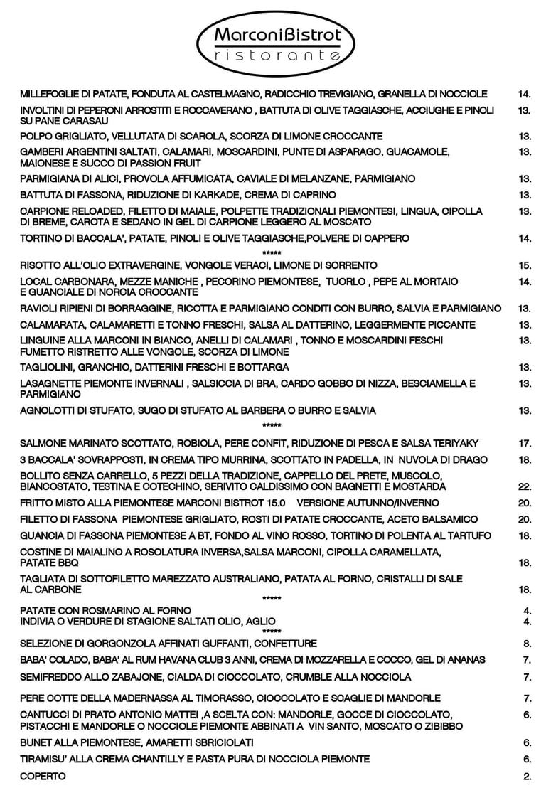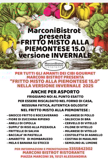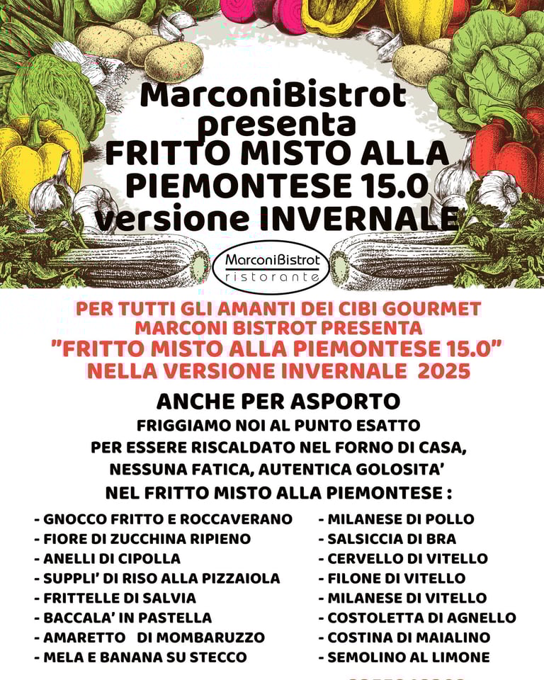 Per tutti gli amanti del buon cibo Gourmet in queste pagine troverete il Menú aggiornato del MarconiBistrot Ristorante, incluso il nostro esclusivo Fritto Misto alla Piemontese 15.0 con 16 ingredienti fritti della tradizione e non solo, nella nuova VERSIONE 2025 !!!